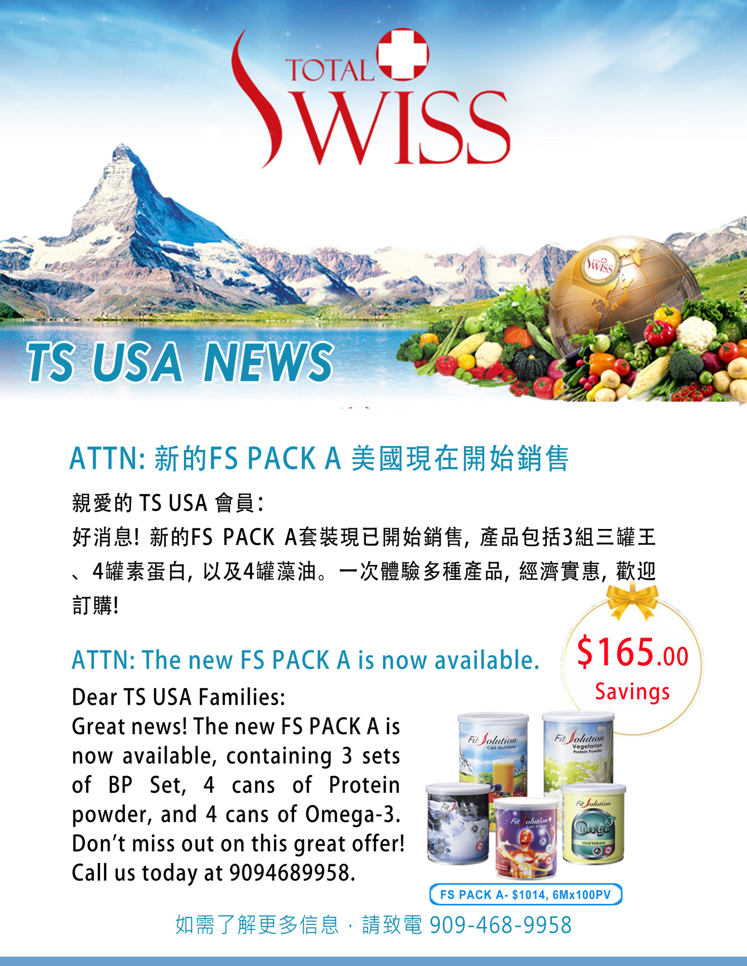 好消息! 新的FS PACK A套裝現已開始銷售, 產品包括3組三罐王、4罐素蛋白, 以及4罐藻油。一次體驗多種產品, 經濟實惠, 歡迎訂購! 詳情請電: 9094689958.